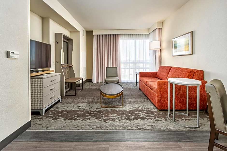 This room features a microwave, small refrigerator, and a seating area. A flat-screen TV is also included.